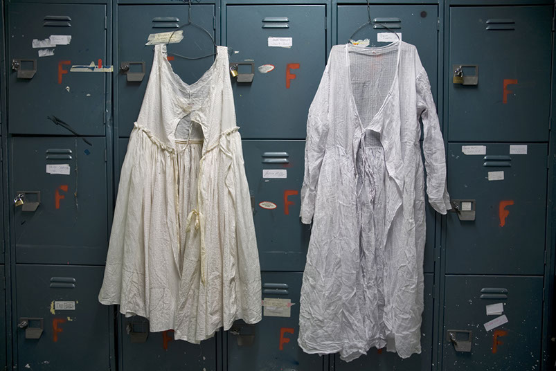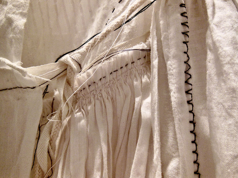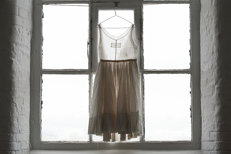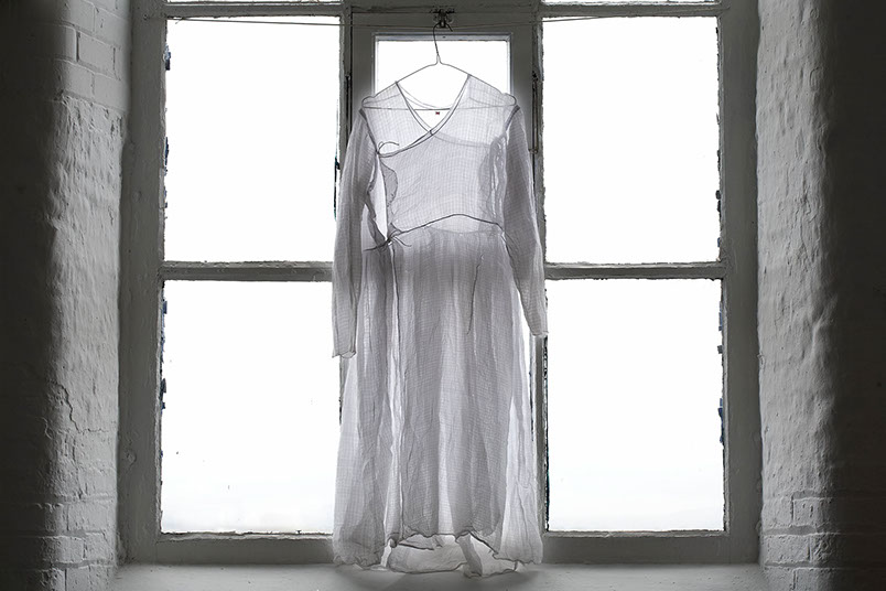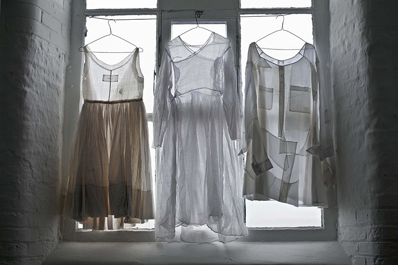 The research culminated in Revive, a dress that Welsh made for The Power of Copying exhibition in at Xuzhou Museum of Art. China. The exhibition focused on creative re-production, developing new ways of learning through “imitation, representation, inheritance, memorization, reproduction, appropriation, transformation, and creation”. The dress referenced a vintage Indian Jama, sourced in Ahmedabad, and was hung alongside the ‘original’. Revive was made from a selection of translucent cotton fabrics, which were printed with a range of traditional Gujarati block prints. The understated white on white patterns combined with layered and pieced ‘sectioning’ re-created the subtleties of an Indian ‘Jama’ garment in a contemporary context.
